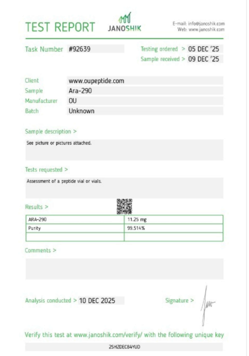 Ara-290 is supplied strictly for laboratory and scientific research purposes only. It is commonly studied in research environments for its potential role in cellular repair pathways, inflammation response research, and tissue recovery models. Researchers often investigate Ara-290 in laboratory settings related to nerve support, body recovery mechanisms, and protective signaling pathways.